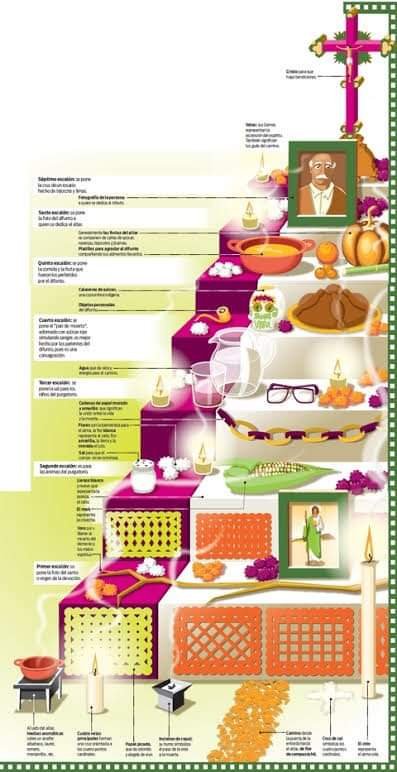 El altar de muertos debe de constar en 7 niveles o escalones que representa los 7 niveles que tiene que pasar el alma de un muerto para poder descansar.